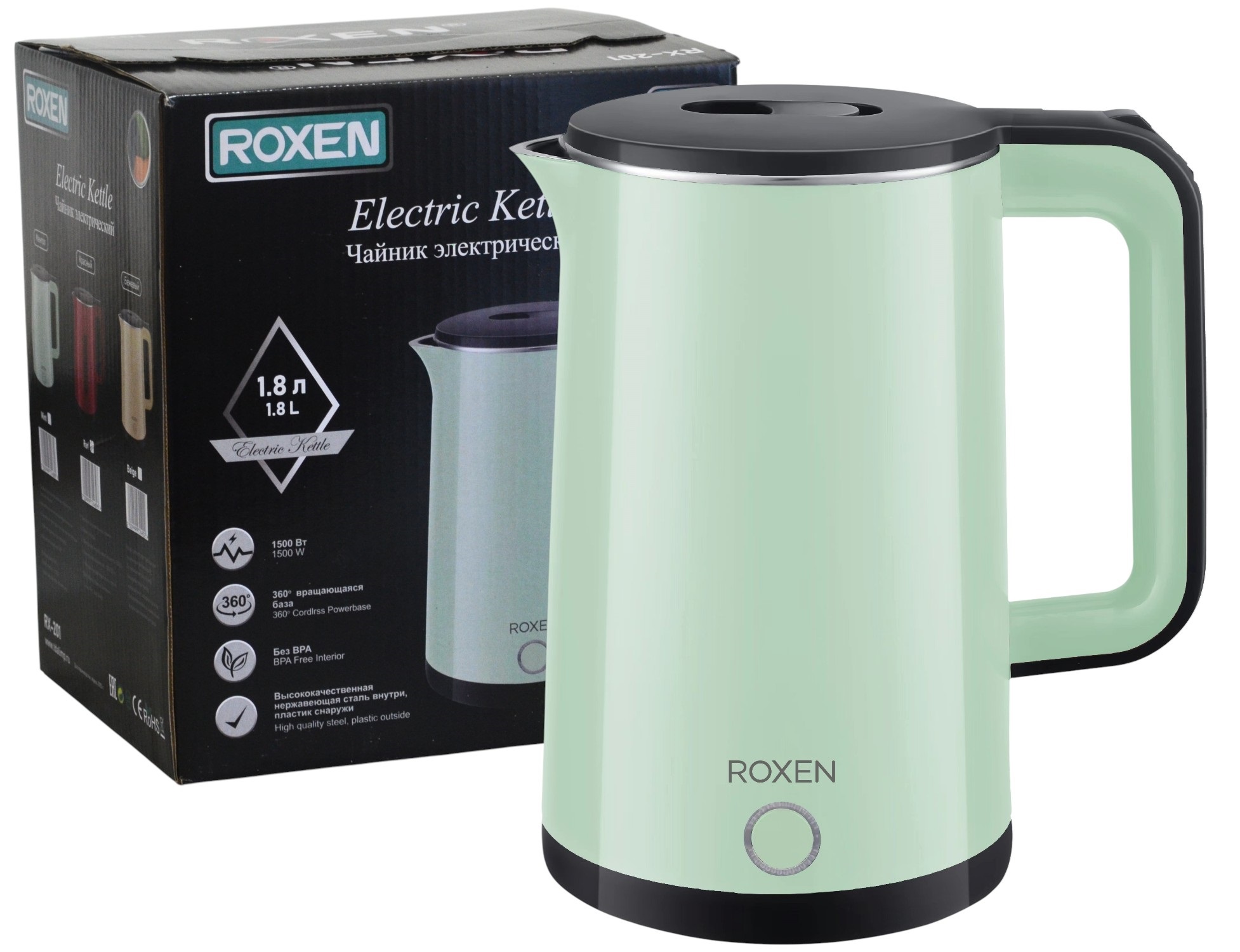 Мощность 1500Вт.Объем 1,8л.Двойной корпус пластик/сталь SUS201.Автоматическое отключение при закипании.Возможность поворота на 360 градусов