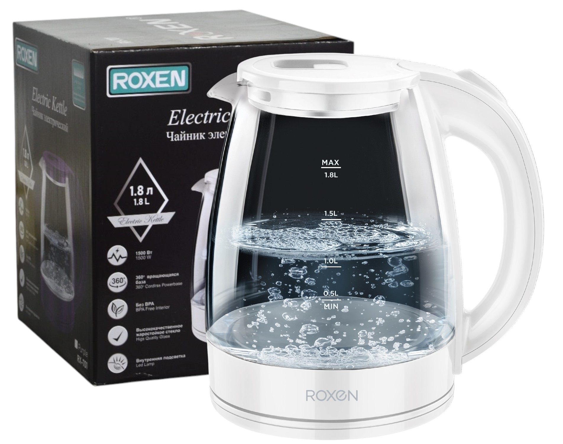 Мощность 1500-1700Вт.Объем 1,8л.Корпус из термостойкого стекла.Автоотключение при закипании.Возможность поворота на подставке на 360*.Закрытый нагревательный элемент из нержавеющей стали.Световой индикатор работы (12)